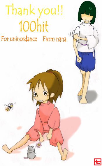 七さんのトコロの100Hitゲットイラストです。 こまごました注文でしたのに…。 ありがとうございました。(^.^) 坊ネズミの後ろ姿が非常にプリチーです。